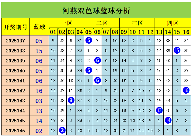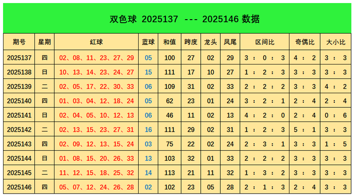 上期回顾:双色球第2025146期开出奖号:红球05、07、12、24、26、28;蓝球02,其中红球三区比为2:1:3,奇偶比2:4,大小比为3:3,蓝球开出2路号码02。